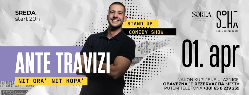 Ante Travizi zasad broji iza sebe preko 1.200 nastupa a 1.Aprila dolazi u Novi Sad u "SOHA BAR" sa svojim nastupom ‘Nit ora’ nit’ kopa’ da proslavimo zajedno 10 godina njegove karijere i to na svetski dan šale! Ne smete propustiti ovaj nastup!