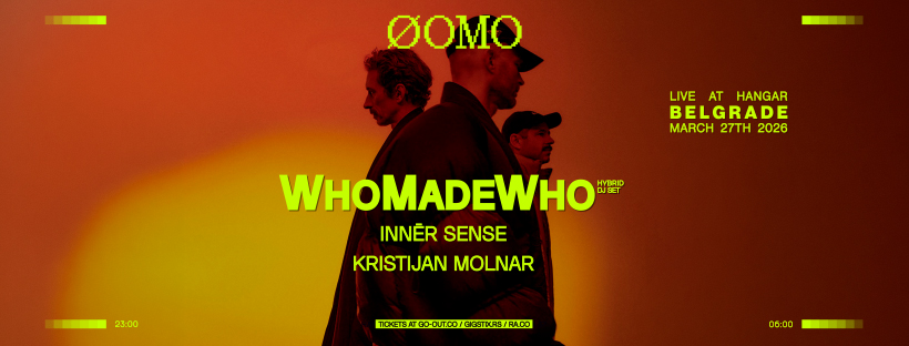 27.⁠ ⁠marta u Hangar, stiže jedan od najuzbudljivijih live elektronskih preformera današnjice WhoMadeWho. Nakon niza rasprodatih događaja, ФOMO nastavlja da podiže standarde scene i otvara novo poglavlje sezone u velikom stilu.