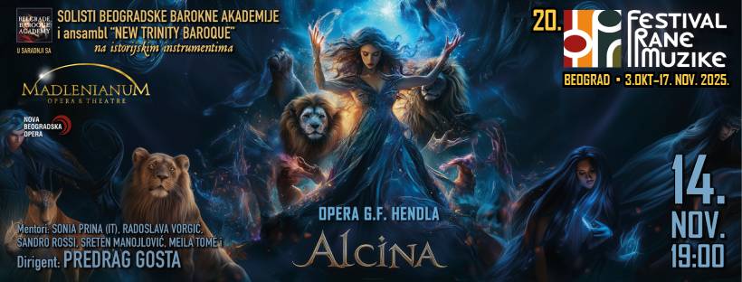 Opera „Alćina”, praizvedena u Londonu 1735. godine, zasnovana je na epizodi iz epa Orlando furioso Ludovika Ariosta i donosi čarobno putovanje kroz svet iluzije, ljubavi i iskupljenja. Na ostrvu čarobnice Alćine, stvarnost i privid neprestano se prepliću – dok ljubav biva i iskušenje i spasenje. Ovaj koncert predstavlja jedinstven muzičko-scenski događaj – polukoncertno izvođenje opere „Alćina” Georga Friedricha Hendla, jednog od najlepših i najpoetičnijih ostvarenja barokne opere.